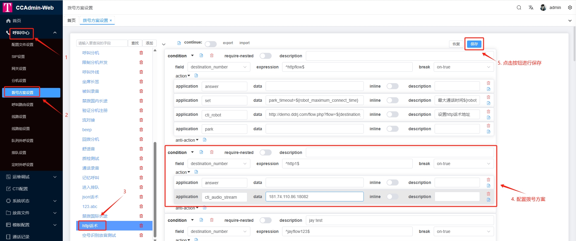 进入呼叫中心->拨号方案设置->http话术 页面,配置一个呼叫http1就进入流对接的例子。具体配置步骤如图所示: